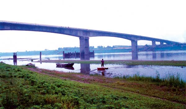 天門漢江大橋長(zhǎng)1329米,主橋孔跨布置為(50 60) (85 116 116 85) (50 50)米三聯(lián)預(yù)應(yīng)力混凝土連續(xù)梁橋,橋?qū)?4.5米,主跨116米,樁基107根,樁徑2米,預(yù)應(yīng)力混凝土連續(xù)變截面箱梁結(jié)構(gòu),于1996年建成,被交通部授予“優(yōu)質(zhì)工程”。