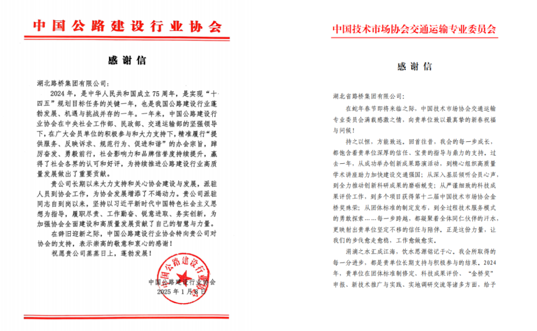 近日,湖北路橋收到來自中國公路建設(shè)行業(yè)協(xié)會、中國技術(shù)市場協(xié)會交通運輸專業(yè)委員會發(fā)來的感謝信,信中對湖北路橋大力支持和關(guān)心協(xié)會建設(shè)與發(fā)展,積極參與協(xié)會各項科技創(chuàng)新、評優(yōu)創(chuàng)獎活動表達了肯定與感謝。